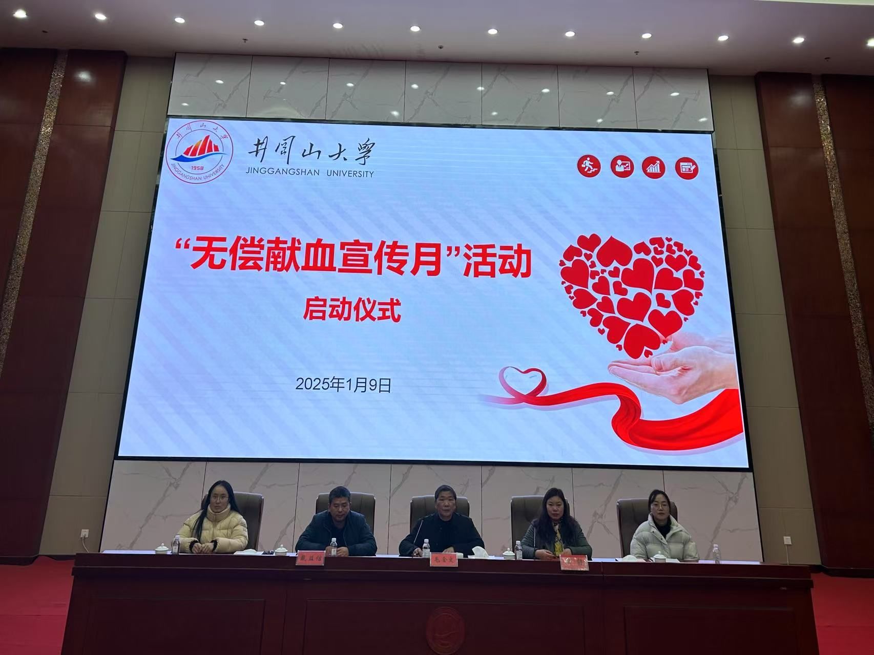 2025年1月9日,井冈山大学在图书馆报告厅举行了“无偿献血宣传月”活动的启动仪式。此次活动旨在进一步弘扬无偿献血精神,提高全校师生对无偿献血重要性的认识,并推动《江西省献血条例》的普及与学习。学生工作部(处)部(处)长毛金文出席了启动仪式,并发表了讲话。各学院相关负责人及学生工作部全体成员参加了此次活动。