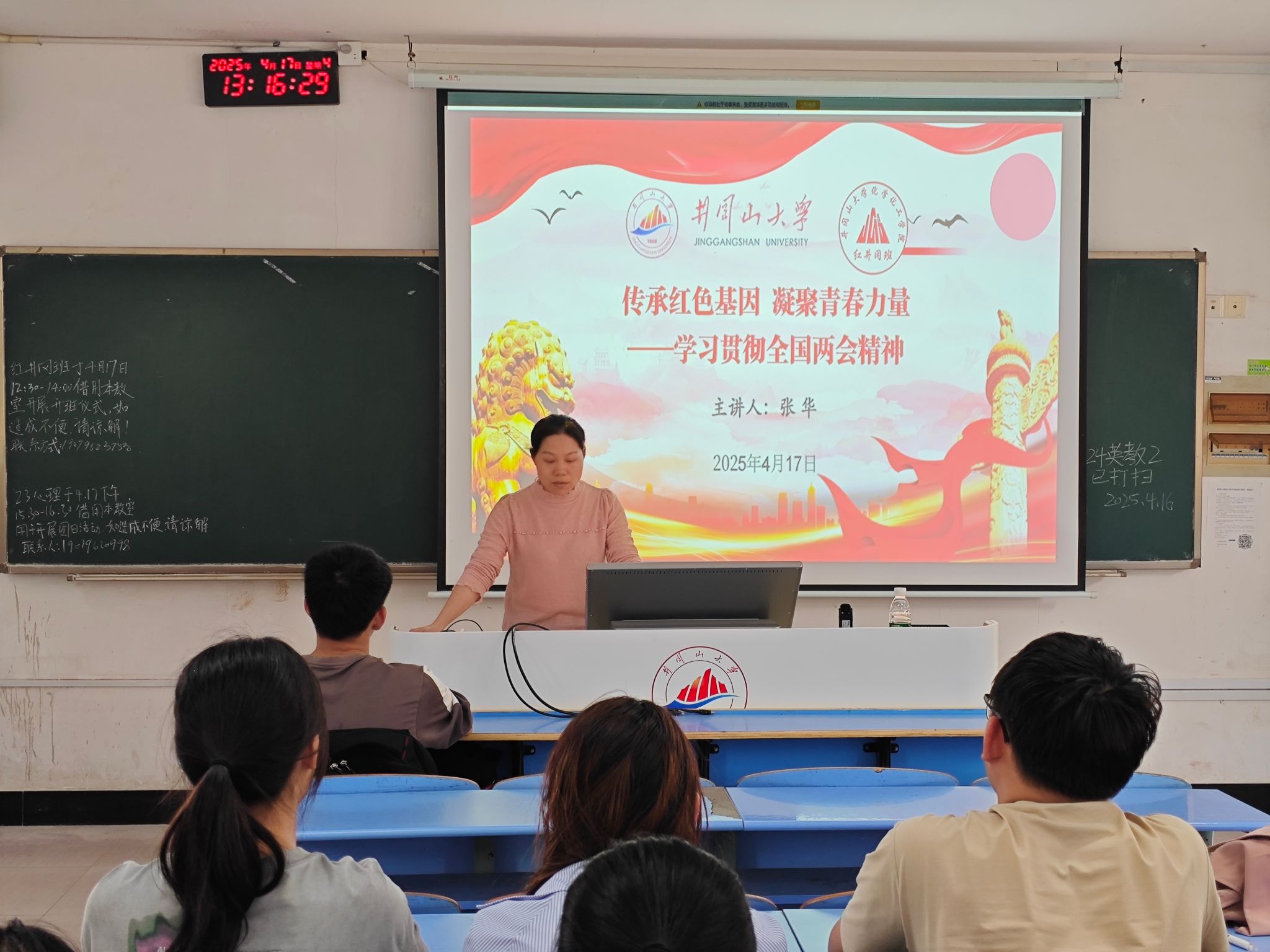 一是深入领会两会精神,把握时代发展脉搏。张华详细阐述了经济高质量发展为青年带来的机遇与使命,强调在民生福祉增进过程中,青年所肩负的责任与担当;二是追溯红色基因根源,汲取奋进精神力量。张华回顾了红色基因形成历程、剖析内涵,引导同学们深刻认知其重要性,汲取红色历史养分,为成长与奋斗赋能;三是担当时代使命,奏响奋进强音。张华对新时代青年使命担当提出要求,期望大家坚定信念、练就本领、担当作为、锤炼品德、艰苦奋斗,成为有志、有识、有为、有德、有恒青年,以实际行动奏响奋进乐章。四是传承红色基因,凝聚青春力量。张华为推动红色基因融入青年成长实践,提出加强红色教育、参与实践、传播文化等路径,号召同学们积极践行,传承发扬红色基因。