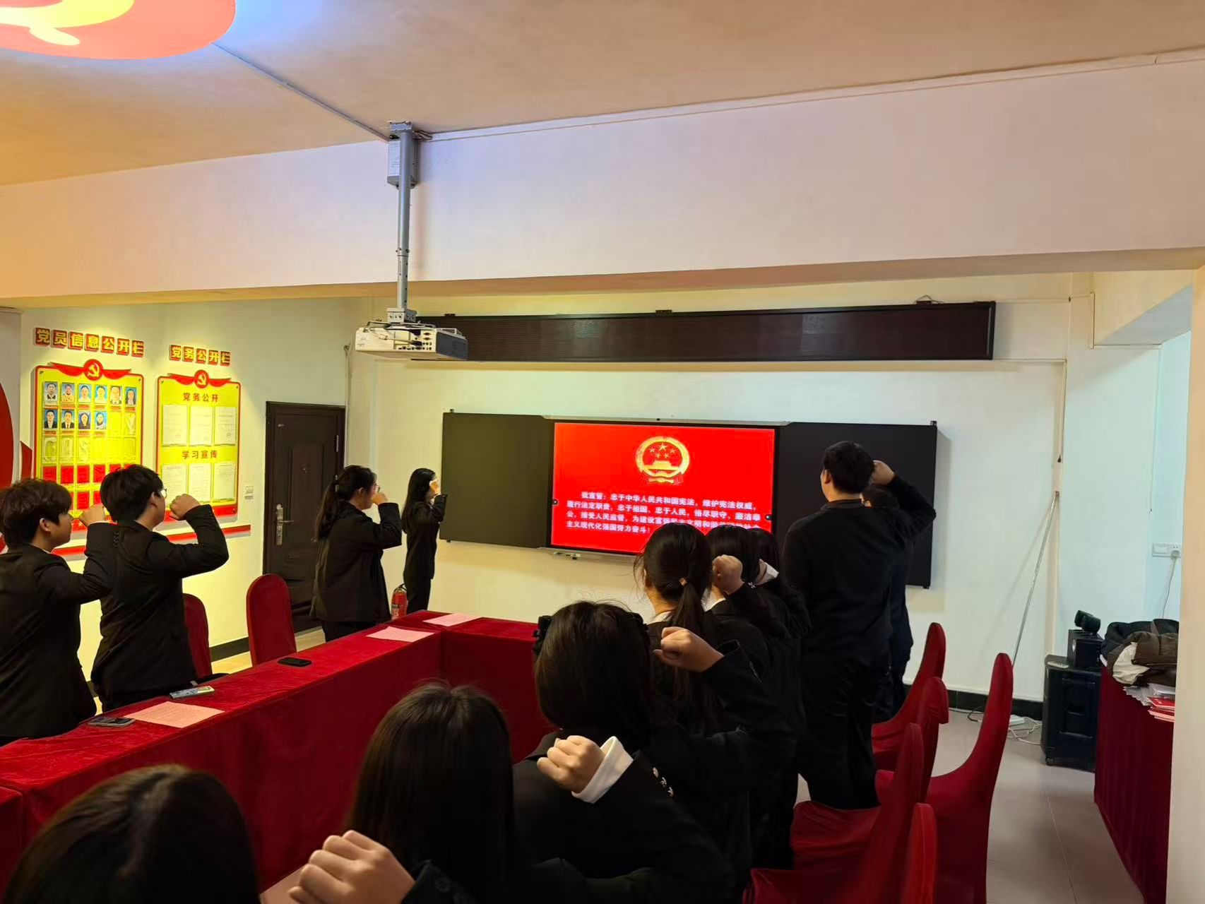 清晨的校园寒意渐浓,但宪法晨读现场却暖意融融。同学们手持宪法文本,在领读人的带领下齐声诵读宪法核心条款,朗朗书声回荡在校园各处,既重温了宪法的庄严内涵,更在集体诵读中凝聚起尊崇宪法、维护宪法的思想共识。晨读结束后,全体人员身着正装庄严宣誓:“我宣誓:忠于中华人民共和国宪法,维护宪法权威,履行法定职责……”铿锵有力的誓言,展现了同学们恪守宪法原则、践行宪法精神的坚定决心,为系列活动拉开了庄重序幕。