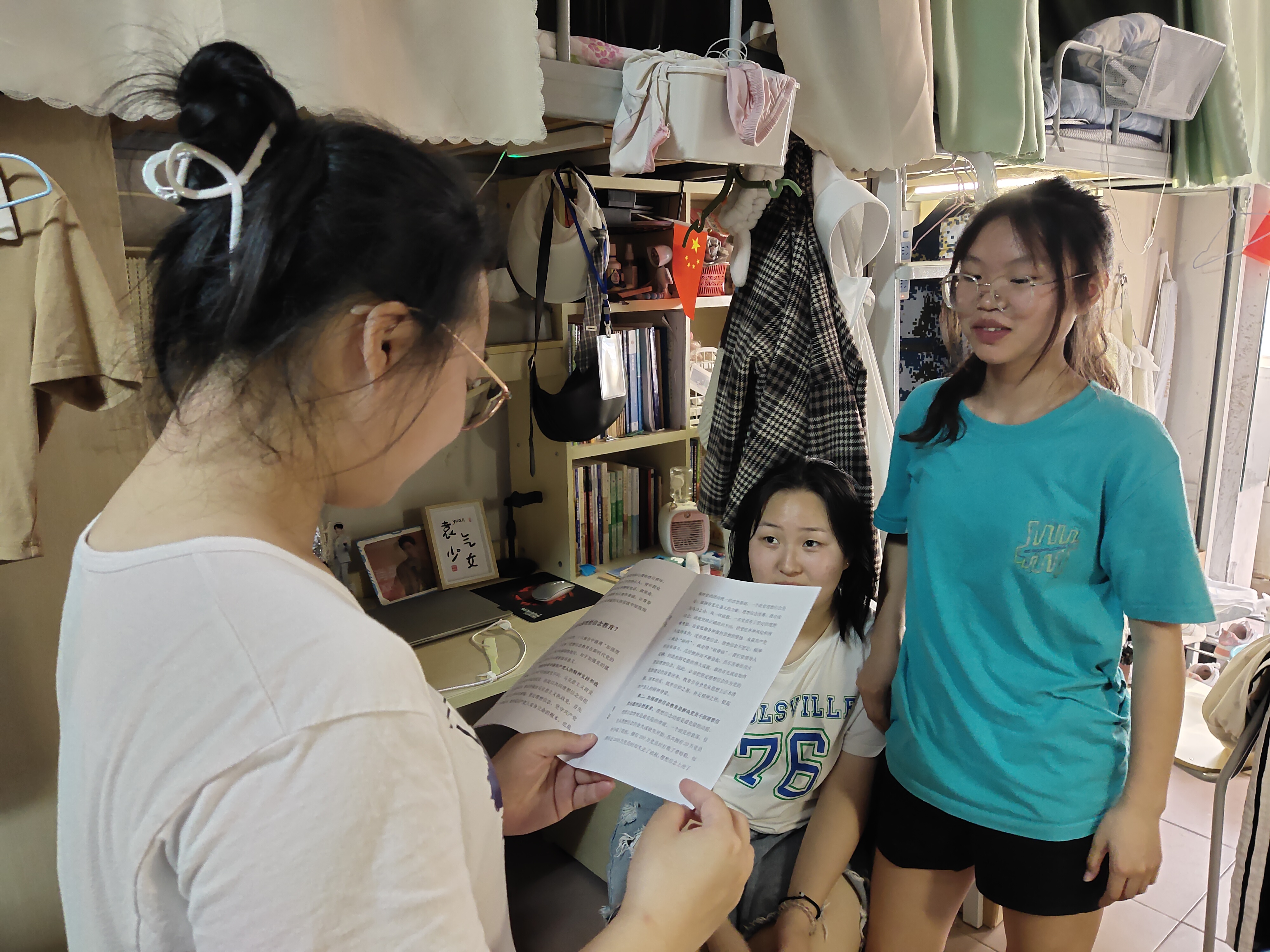 学员们还在宿舍里发放了防范电信网络诈骗、就业创业政策、征兵宣传及考研指导等相关资料。